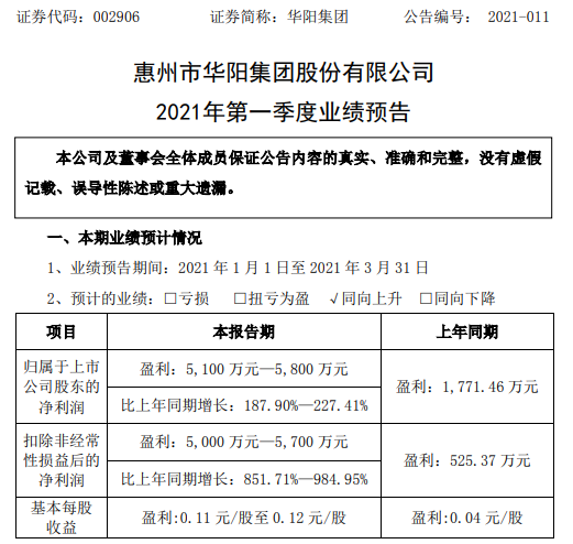 挖贝网4月11日,华阳集团(002906,股吧)(002906)近日发布2021年第一季度业绩预告,预计业绩同向上升。报告期内归属于上市公司股东的净利润5,100万元—5,800万元,比上年同期增长187.90%—227.41%;基本每股收益0.11元/股至0.12元/股。